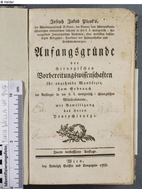 Fundmeldung | Einzelobjekt Anfangsgründe der chirurgischen Vorbreitungswissenschaften fr angehende Wundärzte Lost Art-ID622861 Vorherige Weiter Autor:in Joseph Jacob von Plenck Verlag Grässer TitelAnfangsgründe der chirurgischen Vorbreitungswissenschaften fr angehende WundärzteErscheinungsortWien Erscheinungsdatum1788ObjektartBibliotheksgutObjektgruppeBibliotheksgutSignaturWe-GR 944Beschreibung au dem Titelblatt, nicht mehr leserlich: Ex libris [...]io... Weiterlesen Weniger anzeigen Provenienz ?-? Unbekannter Vorbesitz; [...], 15.11.1996-2013: Museum Wella, angekauft von Antiquariat Gerhard Gruber, Heilbronn; 2013 als Schenkung an dasHLMD Weiterlesen Weniger anzeigen Veröffentlicht seit22.07.2024 Kontakt Hessisches Landesmuseum Darmstadt Friedensplatz 1 64283 Darmstadt Deutschland Tel+49 6151-3601-200Fax+49 06151-1657199E-Mailinfo@hlmd.deHomepagehttps://www.hlmd.de/de/ Ansprechpartner:in Dr. Martin FaassPositionDirektorTel+49 6151-3601-001