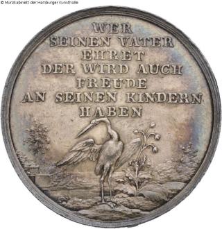 Vorderseite: Die Figur des biblischen Joseph umarmt seinen Vater, die Figur des biblischen Jakob. Im Hintergrund eine Steinwüste mit Bergen und einer Palme, sowie zwei Kamele, Schafe und Widder sowie ein von Pferden (?) gezogener (Streit-)Wagen. Im Abschnitt die Signatur LOOS, zweifacher Linienkreis; Rückseite: Sechszeilige Legende im Feld, darunter stehender Vogel (Ibis?) inmitten einer bergigen Landschaft mit Bäumen, Pflanzen und einem Gewässer, zweifacher Linienkreis, Legende: WER / SEINEN VATER / EHRET / DER WIRD AUCH / FREUDE / AN SEINEN KINDERN / HABEN; guter Zustand.
