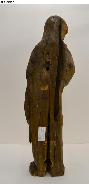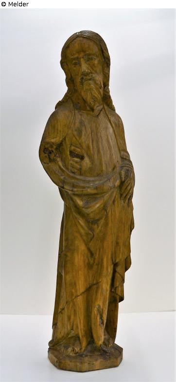 Vollrunde Standfigur mit Plinthe, hinten abgeflacht. Das Gewand von Christus lässt die Seitenwunde frei. Unklares Standmotiv. Weich fallendes Gewand, Faltenkaskaden an der rechten Seite.