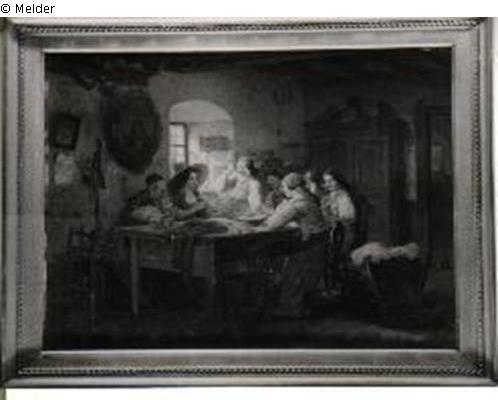 Die Familie um einen Tisch versammelt, aus einer Schüssel essend. Links die Großmutter mit Kind. Links hinten ein Fenster mit Kanarienkäfig. Rechts hinten ein Schrank, davor eine Wiege. An den Wänden Bilder, Uhr, Spiegel etc.
