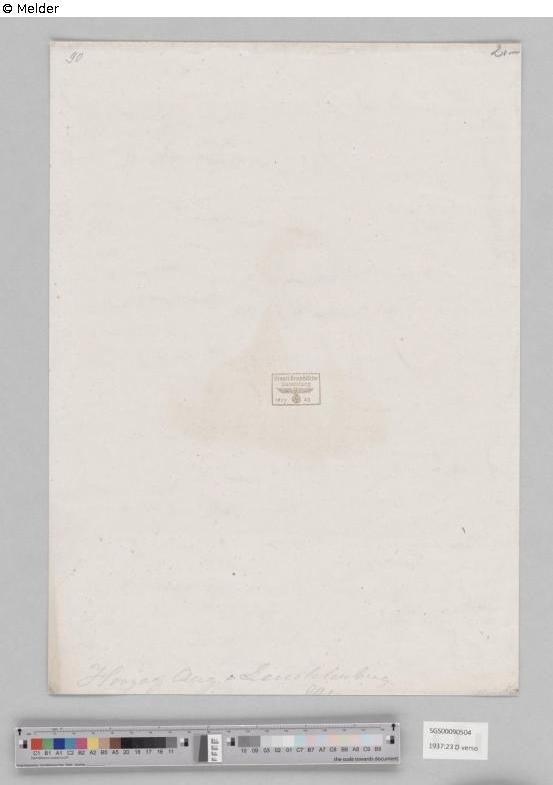 Verso: oben linke Ecke mit Bleistift: „90“; oben rechts mit Bleistift: „2.-“; Mitte Stempel SGSM 18 / Lugt 1094c in braun, darin mit Bleistift: „1937“ und „23“ [Inventarnummer SGSM]; unten am Rand mit Bleistift: „Herzog Aug. v. Leuchtenberg“; darunter vom Blattrand überschnitten (abgeschnitten) mit Bleistift: „9…1“ (901 oder 941?); unten rechts mit Bleistift: abgeschnitten, nicht lesbar.