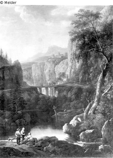 Im Zusammenhang mit dem Pendent (Inventarnummer - mü7612) muss das Bild Rosa zugeschrieben werden. Blick in ein Gebirgstal mit angestautem kleinen See und Brücke. Im Hintergrund die Burg. Vordergrund am Ufer zwei Frauen und ein Mann mit Hund. Auf der Brücke ein Fuhrwerk mit Fuhrmann.