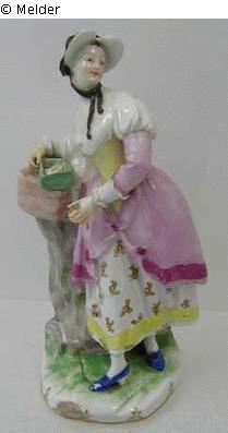 Marke: Wiener Porzellanmanufaktur; Blauer Bindenschild; eingepreßter Bossiererbuchstabe: P: für Anton Peyer, (1762 ? 1787), Buntmalernummer 41 (in Braun) für Anton Mayer, weiße Glasur, bunte Bemalung