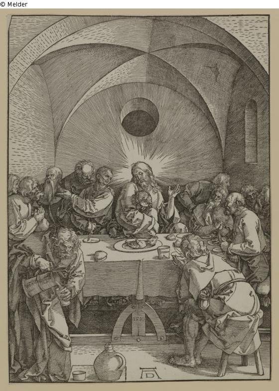 Darstellung des letzten Abendmahls in einem Raum mit Kreuzgradgewölbe. Jesus sitzt mit Johannes im Arm in der Bildmitte.