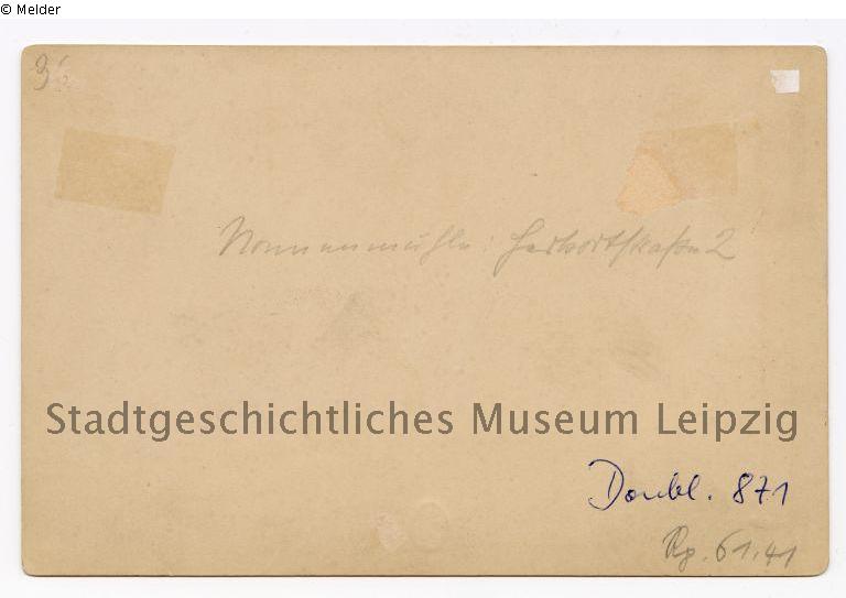 Sepia-Abzug auf Fotopapier auf Pappe, dargestellt ist die alte Nonnenmühle. Im Hintergrund steht die alte Propsteikirche. bez. u. r. (geprägt): Herm. Vogel / Leipzig.; Fotopapier: Ansicht der alten Nonnenmühle. bez. u. l. (geprägt): 1890; Pappe: bez. m. l. (Druck): Leipzig und Umgebung; bez. m. r. (Druck): Photographie und Verlag von Hermann Vogel in Leipzig. / Die alte Nonnenmühle.