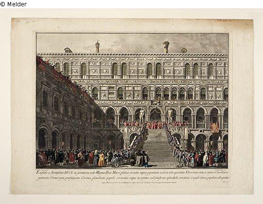 Beschriftung: Antonius Canal pinxit. / Jo. Bap. Brustolon inc. / Expleto a Serenissimo DUCE in gestatoria sede Magnae Divi Marci plateae circuitu supra gigantum scalam ... No. 3.