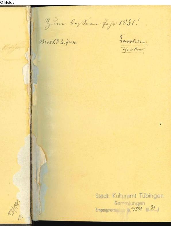 Handschriftlich: "Zum besseren Jahr 1851! Brest.d.3.Jan. Caroline Theodor" (?) (die Namen untereinander und beide unterstrichen); Diverse Nummern handschriftlich vermerkt: "50,-", "38/191...", "65,- K", "so 1.28**"; Stempel vom Kulturamt Tübingen.