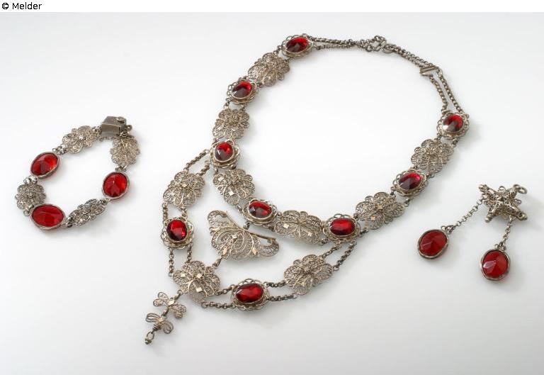 Sieben ovale Almandine, Oberseite mit Facettenschliff, Rückseite in Silberfassung, Rahmung gebogt. Die Filigranglieder aus je vier größeren Blättern in Form von Spitzovalen, dazwischen kleinere Blätter von gleicher Form. An den Enden jeweils zwei Erbsketten mit Ring bzw. Knebel, letzterer an zwei weiteren kleinen Ketten. Vorne in der Mitte an der Kette hängend eine zweite mit zwei Almandinen und drei Filigrangliedern wie vorher. Beide Ketten durch fächerförmiges Zwischenglied miteinander verbunden, unten in der Mitte an der zweiten Kette hängend zwei kleine Filigranschleifen.