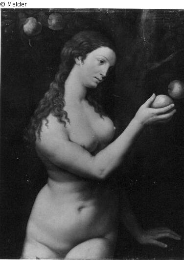 Signiert und datiert: F(?) F 1559; Unter Apfelbaum weibl. Halbakt nach rechts, in erhobenen Rechten Apfel, stützt sich mit der Linken auf.