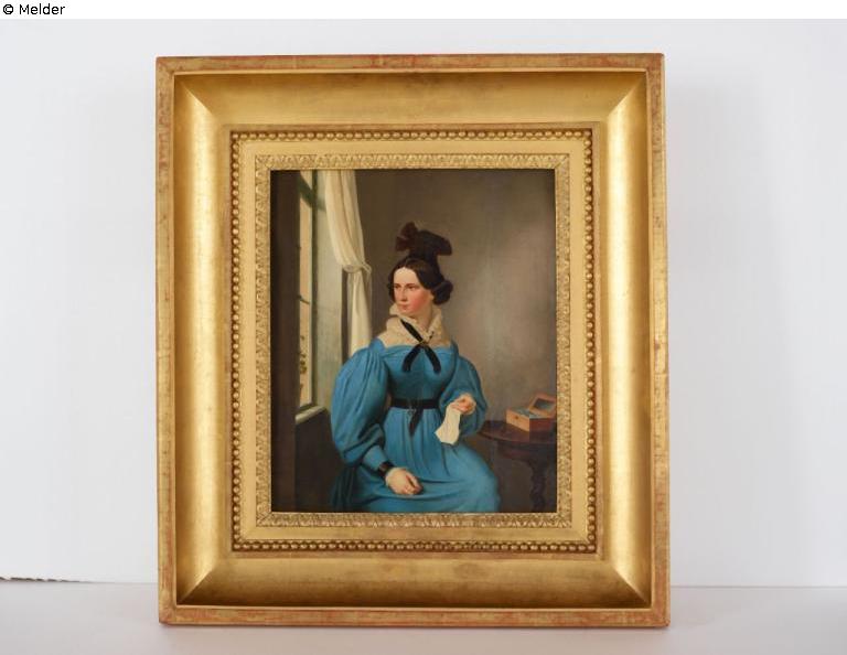 Frau mit Nähzeug am Fenster