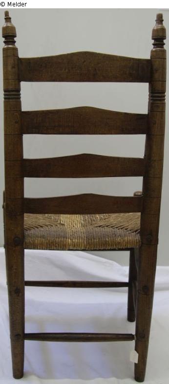 gedrehte Beine, allseitig mit 2 runden Sprossen verstrebt, an der Rückenlehne 4 geschweifte Sprossen. Sitz trapezförmig, aus Reet geflochten
