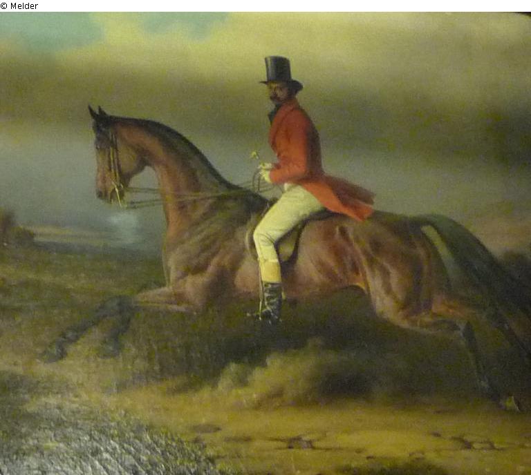 Galoppierender Reiter in rotem Jagdrock /(Reiterbildnis von Fabrice mit Braunem)