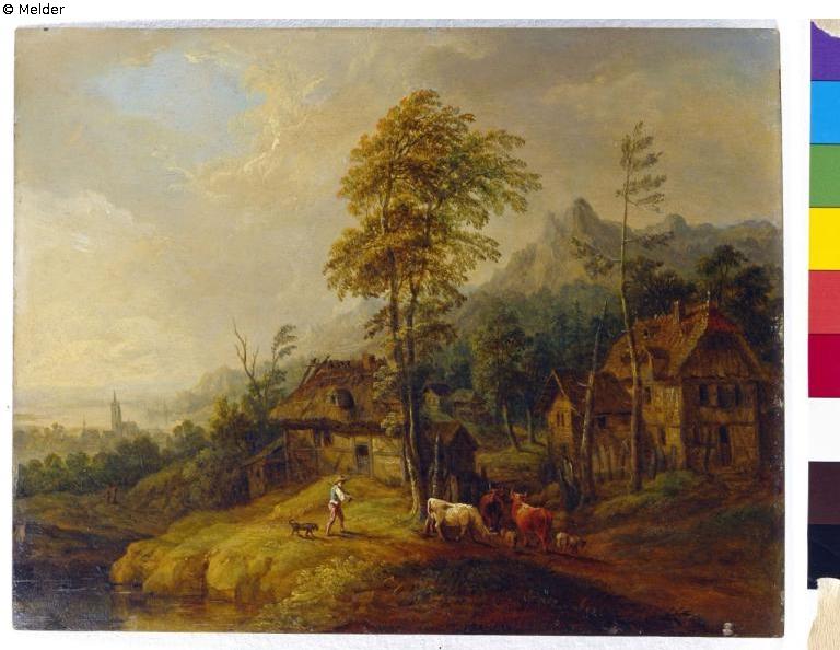 Berglandschaft mit zwei Häusern und einem Hirten mit Kühen im Vordergrund