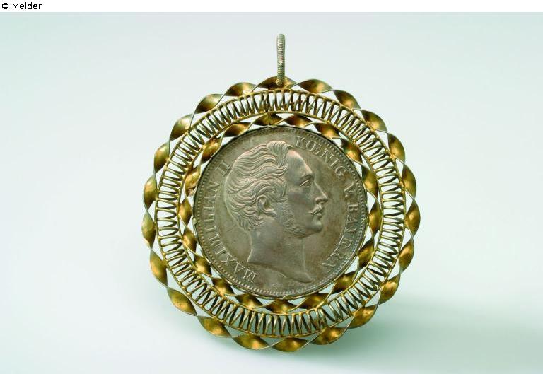 Vergoldeter Doppelgulden anlässlich der Wiederherstellung der Mariensäule unter Maximilian II. Joseph, umgeben von einer Fassung aus zwei gedrehten und vergoldeten Silberbändern, dazwischen Spirale aus Silberdraht. Vergoldung der Münze fast völlig abgerieben. An der Oberseite ovale, gerillte Öse.