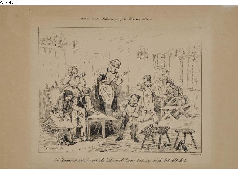 Die schwarz-weiße Lithographie ist Nr. 2 einer Serie und hat den Titel "Nu kümmt hahl mek de Düwel keine rut, die nich betahlt het". Verlag C. Schrader, Hannover.