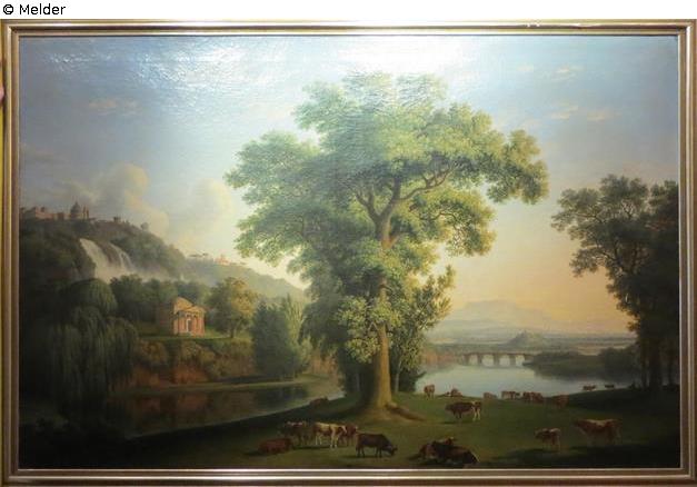 Die Bildmitte der klassisch-italienischen Landschaft dominiert ein großer Laubbaum, der als „Drehpunkt“ das Landschaftsgemälde gliedert. Auf der Wiese um den Baum weidet eine Rinderherde. Links ein kleiner Tempel vor den Cascatelle des Aniene, auf der Anhöhe darüber die Stadt Tivoli. Rechts öffnet sich ein weiter Ausblick: Über den Aniene-Fluss im Mittelgrund führt eine Brücke. Dahinter die Ebene der Campagna, die durch einen Tafelberg abgeschlossen wird.