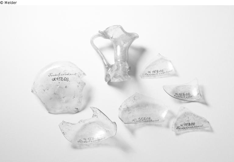 Einhenkeliges Kännchen, aus naturfarben grünlichem Glas, eingedellter Boden, kegelförmiger Körper, Hals mit Kleeblattschnauze; zerscherbt