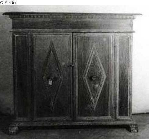 Kleines Buffet auf Krallenfüßen stehend, Doppeltür mit je einem Rhombus und Knopf zwischen zwei schmalen Außenfeldern. Oben kein Schubfach, profilierte Abschlußleiste.