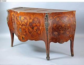 Inventarbuch-Eintrag 5.9.1952: Rokoko-Kommode geschweift mit Rauten-Intarsien. Reiche Bronzebeschläge.