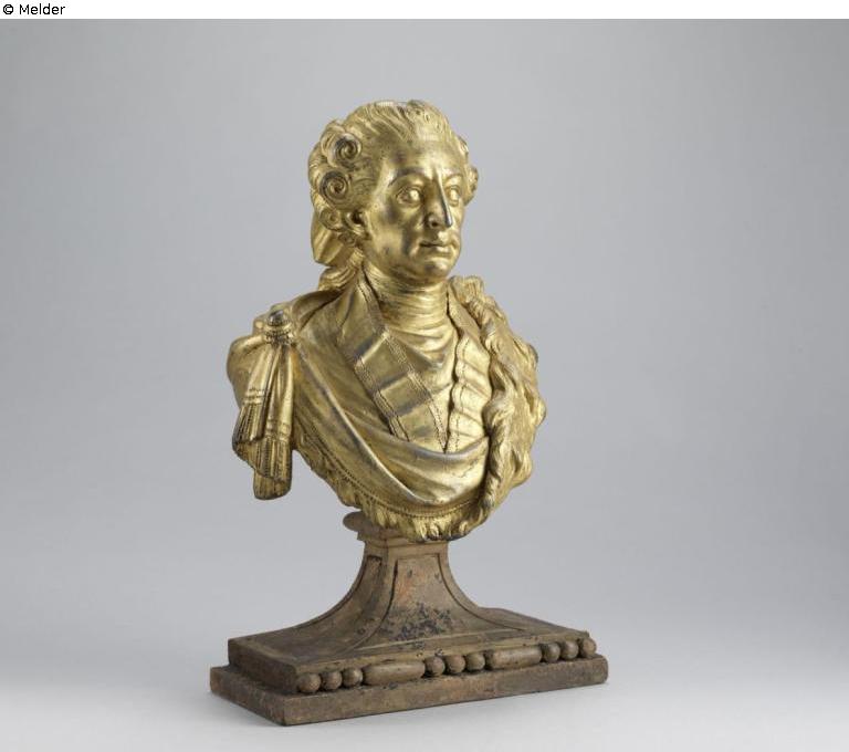 Rundplastische Büste mit Abschluss in Schulterhöhe, unten oval ausladend. Kurfürst trägt breites Ordensband, daran das Kleinod des Ordens vom Goldenen Vlies. Die Büste ist auf einen querrechteckigen, nach oben konkav einschwingenden Sockel montiert. Vergoldung an den erhabenen Stellen - v.a. Nasenrücken, Augenbrauen und Falten des Ordensbandes - stark abgerieben. Zahlreiche Kerben und Kratzer, besonders im Gesicht. Holzsockel mit Resten von Vergoldung und roter Grundierung. Heute mit zwei Metallschrauben auf neuem Holzpflock befestigt, der auf dem ehemals vergoldeten Holzsockel aufliegt.
