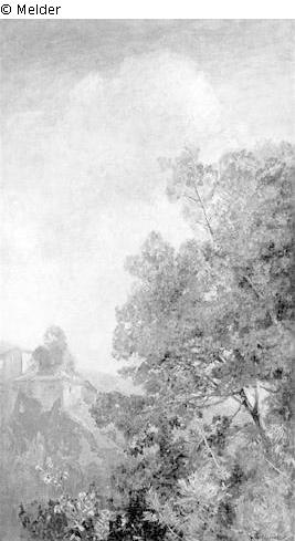 Signatur: G. Schönleber; Rechts Baumgruppe, von unten gesehen. Links Häuser, dahinter bewaldete Bergrücken.