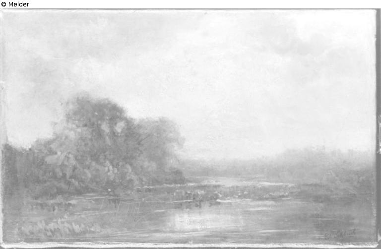 Landschaft mit Kühen am Wasser