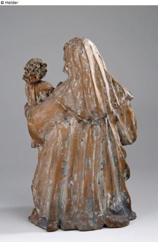 Vollplastische Gruppe aus rötlichem Ton. Auf dem linken Knie der sitzenden Maria steht der segnende Jesusknabe, den sie mit ihrer Linken stützt, während die Rechte in den auf den Schoß gelegten Mantel greift. Maria mit gegürtetem Gewand, Kopftuch und Mantel mit Fransensaum.