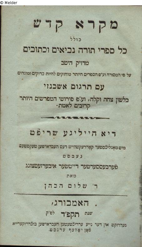 Mikra kodesh kolal kol sifrei torah, nevi'im u-ketuvim im targum ashkenaz (Die Heilige Schrift einschließlich aller Bücher der Torah, der Propheten und Schriften mit deutscher Übersetzung)