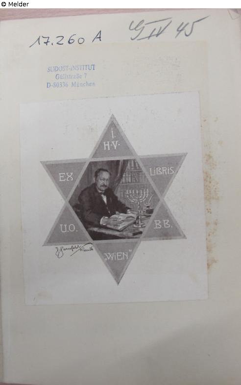 vor 1918 Josef Schur, nach 1926 B’nai-Brith-Bibliothek, Oktober 1938 beschlagnahmt und in das RSHA nach Berlin transportiert, 1985 Südost-Institut München