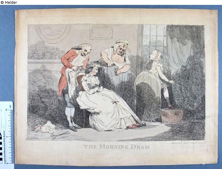 Satiredarstellung einer Lady, die gerade aufgewacht ist und sich von einem französischen Friseur die Haare kämmen lässt