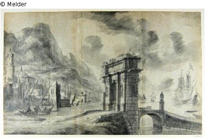 Phantastische Hafenstadt am Gebirge, vorn Brücke mit Bogen