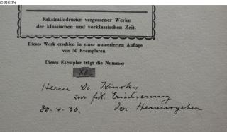 handschriftliche Widmung: "Herrn Dr. Kinsky zur frdl. Erinnerung, 30.04.36. Der Herausgeber"; Rundstempel: "Musikwissenschaftliches Institut der Universität Köln"; handschriftliche Inventarnummer: "9,1100";