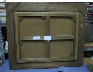 verso, Rahmen, oben rechts in Bleistift: […]16"; oben mittig in Bleistift: "16 J. […?]" und "BPA"; oben rechts in blau: "Wie 1937/16"; in Bleistift: "79"; Mitte rechts in Tinte: "3250 79 [?]"; auf senkrechter Keilrahmenleiste zwei Etikette: “Umkreis d.h. Mitarbeiter von Gustave Courbet (Oranans bei Besançon 1819–La Tour de Peilz, Schweiz, 1877) Jura Landschaft. Laut Epertise von Jean-Jacques Fernier vom Institut Gustave Courbet in Ornans (1. Februar 2006, s. Unterlagen) handelt”; “es sich um das Werk eines Mitarbeiters (wohl Marcel Ordinaire 1848–1896), wie sie Courbet seit Sommer 1872 beschäftigte, mit Korrekturen des Malers. In der Signatur ‘G. Courbet’ ist das t bei der Rentoilage samt einer Partie rechts entfallen. Ohnehin könnte der Namenszug von einem Mitarbeiter eingefügt worden sein. Fernier nennt den Grund, weist auch auf Mängel im Erhaltungszustand des Bildes hin.”