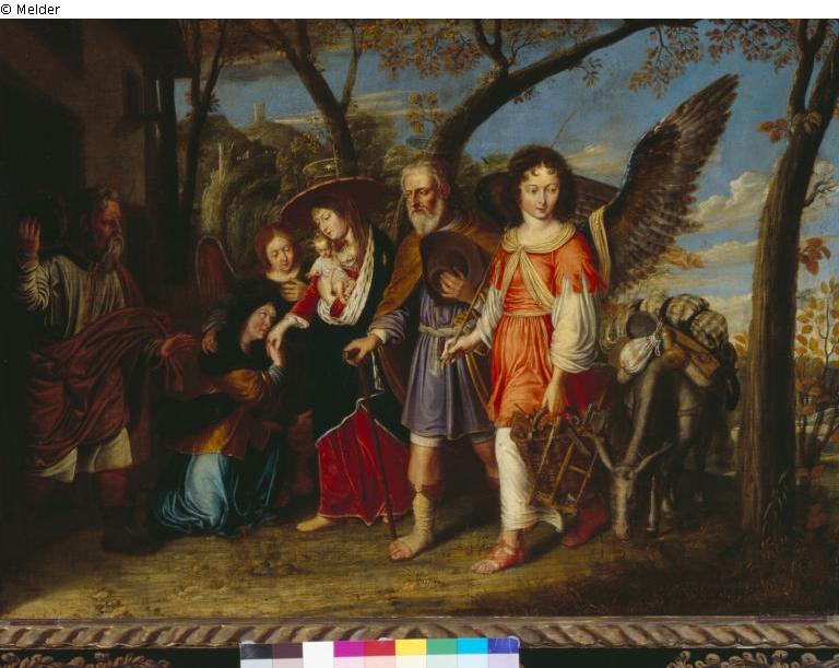 Die Heilige Familie kehrt aus Ägypten zurück und wird von einem Engel geleitet. Gemälde im Rahmen. Signaturen unter dem rechten Fuß des Josef und bei dem linken Hinterbein des Esels. Bez. u. r.: "CHMP/W fec / 1657". Bez. u. mittig: "CHMP / W feci". Provenienzmerkmale auf der Rückseite: Stempel aus Amsterdam und vom Zoll Oldenburg.