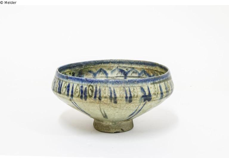 Mittelfeiner, heller Scherben. Transparente, farblose Glasur, grünlich schimmernd. Bemalung in Kobaltblau und Schwarz, zum Teil in die Glasur angeschwommen