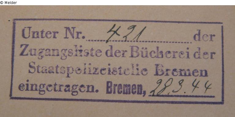 Auf Schmutztitel rechteckiger Stempel bez. "Unter Nr. 421 der Zugangsliste der Bücherei der Staatspolizei Bremen eingetragen, Bremen 28.3.44