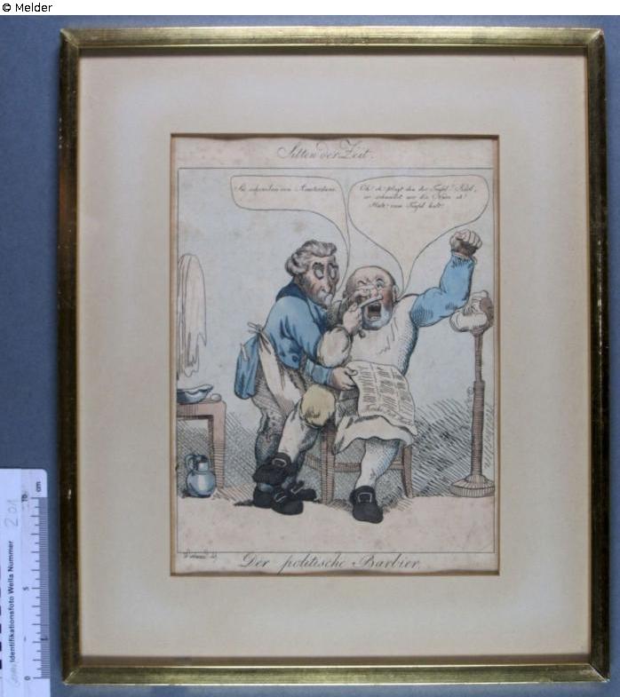 Sitten der Zeit" (in Karrikaturen dargestellt). 6: "Der politische Barbier