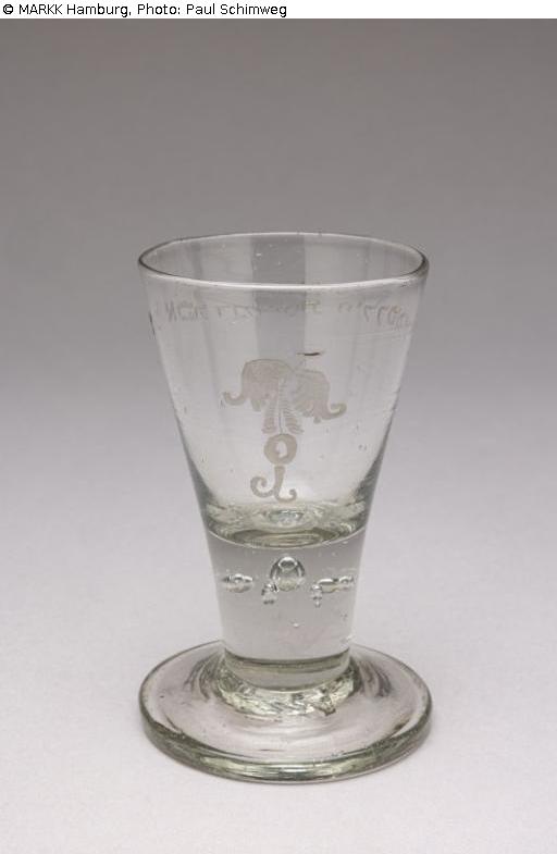 Trichterglas mit kurzem, dickem, in die Kuppa übergehenden Schaft und rundem, flachem Fuß. Dickwandig. Im Schaftübergang sechs kleine Blasen, angeordnet um eine große Blase als Einschluss. Unterhalb des Glasrandes im Halbrund eine einzeilige hebräische Inschrift, gegenüberliegend eingraviert ein Zweig mit hängender Blüte. Vermutlich gewidmet, aber ohne religiöse Funktion.