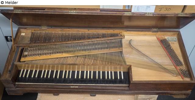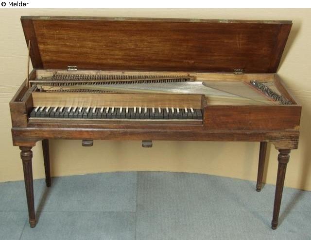 Stoßmechanik, F1 bis f3, zweichörig, rechtsstimmig. Kein Notenpult. Gestell mit vier gedrehten, kannelierten Spitzfüßen, in Fußklötze und den Unterboden eingedreht. Zwei Kniehebel. Oberfläche mattiert.