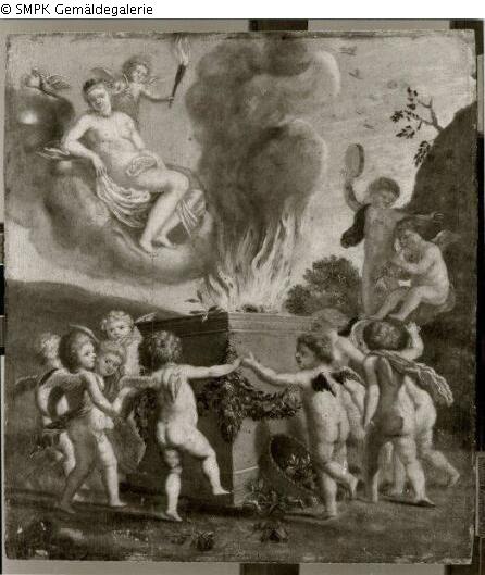 Tanzende und musiziernde Amoretten an einem blumengeschmückten Altar mit loderndem Feuer