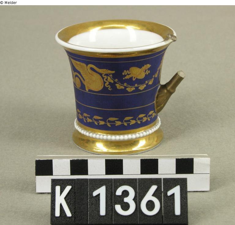 Eine ganz in Dunkelblau und Gold verzierte Tasse, deren Henkel fast ganz abgebrochen ist. Gegenüber dem Henkelrest ist im oberen Drittel in einem goldenen Rahmen der Name 'C. Goaissen' (?) in Gold auf Blau in Schreibschrift geschrieben. Rechts und links je ein großer Vogel (Schwan?) mit Blattgirlanden im Schnabel, über den Girlanden 2 goldfarbene Gebilde (Musikinstrumente). Weiter unten auf dem dunkelblauen Untergrund eine stilisierte Blütengirlande rings herum, darunter auf dem goldenen Fußsockel ein dichter Kranz weißer Porzellanperlen.