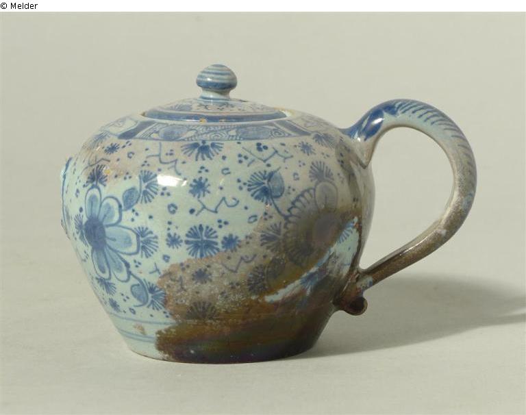 Kleine Teekanne, breite Schulter, Deckel flach, Ohrenhenkel mit kleiner Volute unten; hellblaue Glasur, Inglasurmalerei in blau: Blüten und Fiederblätter, Punktornamente und kurze Linien; unten umlaufende Linien, oben vierteilige Bordüre mit Blüten und Spiralornamenten, Ausguss abgebrochen; (untypische Kannenform), Marke BP; Brandspuren.