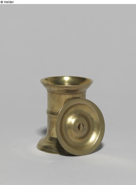 Tintenfass. Die schlichte zylindrische Form wird in der Mitte der Leibung von einem profilierten Ring abgesetzt. Der Fuß schwingt sich verbreiternd erst konkav dann konvex aus. Auch er ist profiliert wie der obere, etwas konvex ausschwingende Rand. In diese ausgeweitete Form fügt sich der nur aufgelegte Deckel ein. Seine Mitte mit dem Loch für den Gänsekiel wölbt sich wieder nach oben.