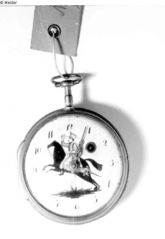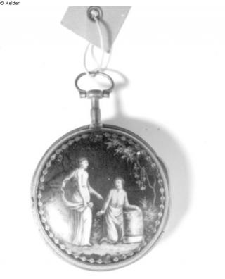 Spindeltaschenuhr mit arabischem Emailleziffernblatt. Im Hintergrund in polychromer Emaillemalerei Darstellung einer galanten Frau und einer Amphora im Freien. Neben der Stundenanzeige zusätzlich Sekundenzeiger und Datumsangabe. Uhrengehäuse weist Punzierungen auf. Eingeprägt sind ALW und die Nummer 2215. Auf der Werksplatine die Majuskeln AR für avance-retard auf Skalierungsrädchen. Signiert "Le Roy à Paris". Herstellungsort: unbekannt