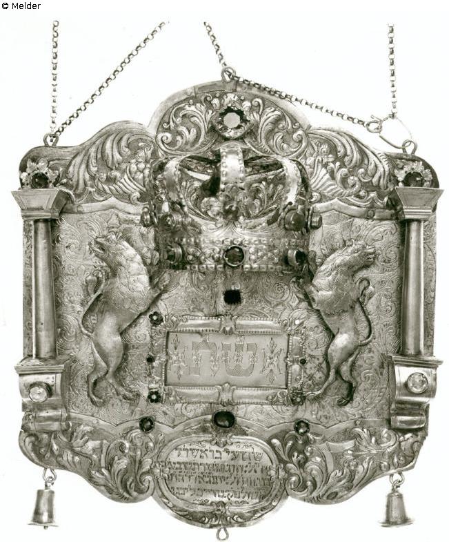 Rechteckiges Tora-Schild (hebr. Tass) mit geschwungenem oberem und unterem Rand. Auf beiden Seiten je eine vollrunde Säule mit einer Flamme, die von einem roten Glasstein bekrönt wird. In der unteren Mitte ovale Kartusche mit hebräischer Inschrift, darüber das Schilderfeld für die Festtage, das von zwei steigenden Löwen mit vergoldeter Mähne flankiert wird. Diese halten in den Pranken eine mit Glassteinen dekorierte Bügelkrone. Schildgrund mit reichem Akanthusdekor. Hebräische Stifterinschrift des Schmaja Ben Ascher David und seiner Frau Schewa Bat Menachem aus Treuchtlingen aus dem Jahr 1754.