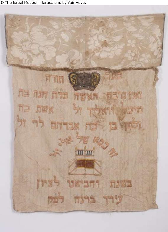 Torah ark curtain for circumcision ceremony with depiction of Elijah's chair