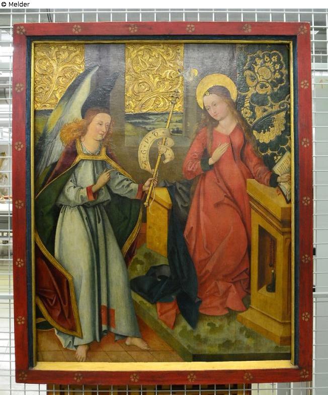 In einem Innenraum kniet Maria auf der Linken vor einem Betpult mit aufgeschlagenem Buch in rotem Gewand und blauem Mantel, von rechts kommend der Erzengel Gabriel in weißer gegürteter Tunika und einem Umhang mit grünem Innenfütter. In seiner Linken hält er einen Stab mit einer Schriftrolle, darauf in gotischen majuskeln "AGPDT". Im Hintergrund des Raumes zwei Fenster mit Blick auf eine Landschaft ein punzierter Goldgrund.