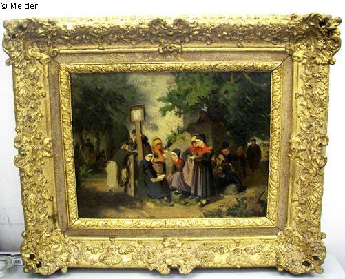 Links im Bild das geöffnete Tor der Dorfkirche. Davor stehende und sitzende Dorfjugend, auf den Pastor wartend. Alle mit Häubchen. Links daneben auf einen Zaun gelehnt ein Junge mit Mütze. Rechts im Hintergrund der Pastor nahend. Links von der Gruppe Staffage unter Bäumen.