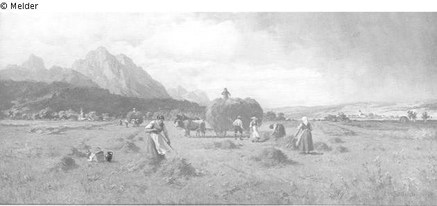 Signatur: Rob. Schleich; In Mitte der Heuwagen mit Gespann nach links. Vorn rechende Bäuerin. Links hinten hohe Berge, rechts Blick auf ein Dorf.
