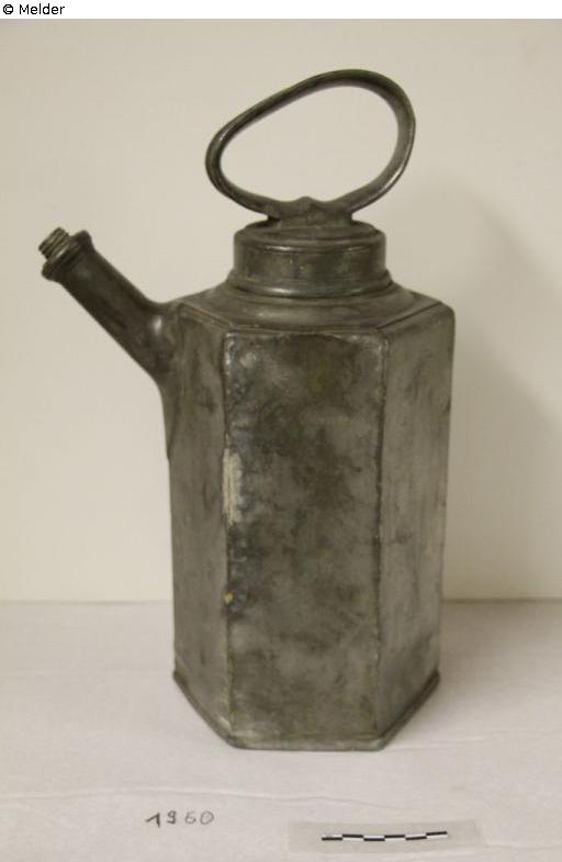 Sechseitiger Körper mit verstärkter Fußkante und Röhrenausguss; Schraubverschluss fehlt. Um die Schulter und Ausguss Zickzackbandverzierung. Auf großem Schraubverschluss Blattbandverzierung und Perlstab. Bandförmiger, fester Tragegriff. Luftloch im Schraubdeckel; zum Transport von Wein- und Apfelmost.